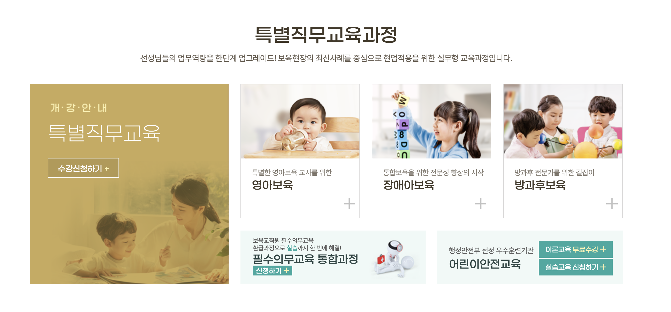 - 방과후보육: 방과후 보육을 담당하는 교사 및 원장을 위한 교육 과정입니다.