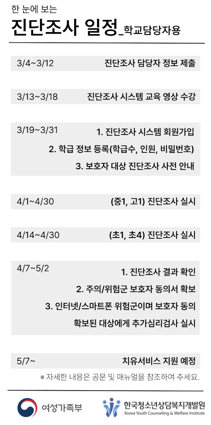 중학교1학년 및 고등학교1학년 학생들이 4월 1일부터 30일까지 진행하고, 이후 4월 14일 부터 초1 및 초4 학생들이 검사에 참여하게 됩니다. 참고로 초등학생은 스스로 할 수 없기에 학부모님이 대신 참여해주셔야 합니다.