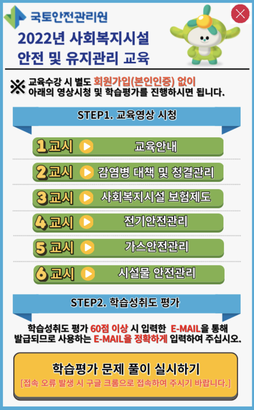 교육 수강 시 별도 회원가입 (본인인증) 없이 아래의 영상시청 및 학습평가를 진행하시면 됩니다.