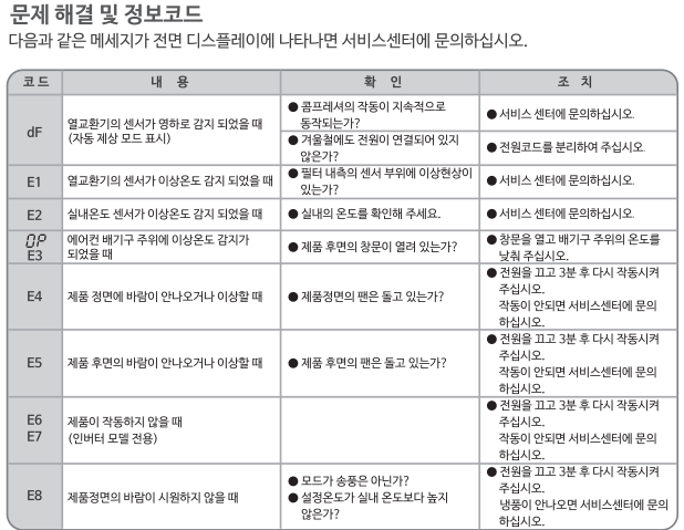 | E8 | 제품정면의 바람이 시원하지 않을 때 | 모드가 송풍은 아닌가? 설정온도가 실내 온도보다 높지 않은가? |