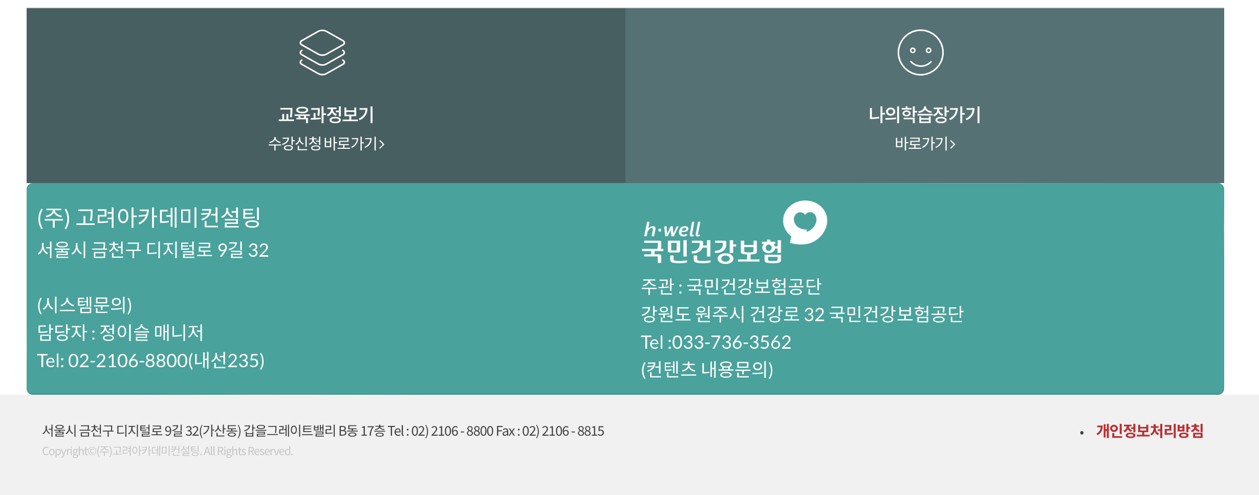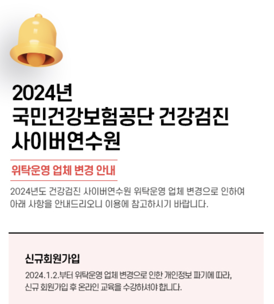 2024년 국민건강보험공단 건강검진 사이버연수원 위탁운영업체 변경으로 신규 회원가입 후 온라인 교육을 수강하시기 바랍니다.