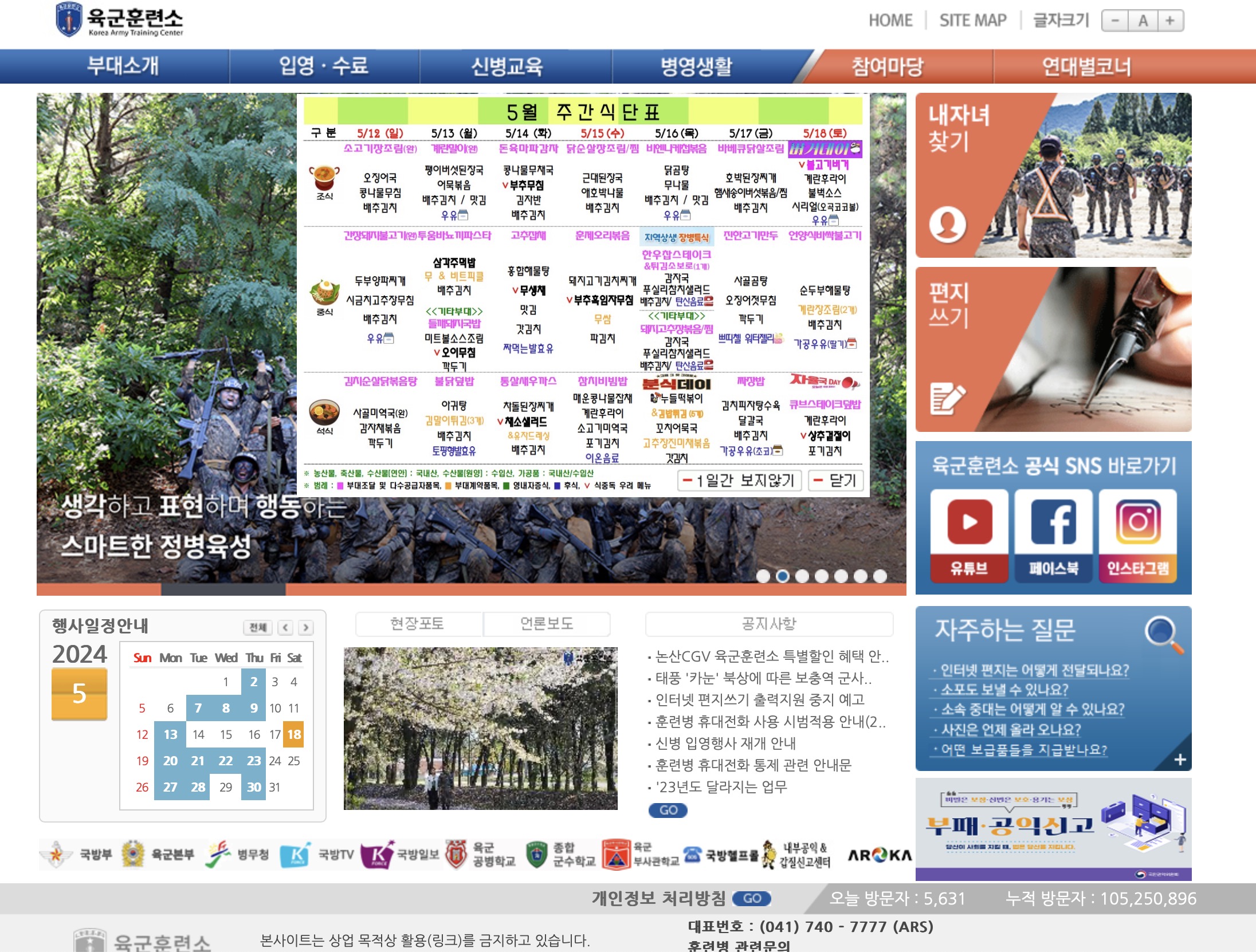 부대소개 및 입영 수료 신병교육 병영생활 참여마당 연대별 코너를 확인할 수 있습니다. 특히 참여마당에서 훈련소에 입소한 자식 친구 연인 선후배 등 편지쓰기를 통해 인터넷을 통해 훈련병과 연락을 주고받을 수 있습니다.