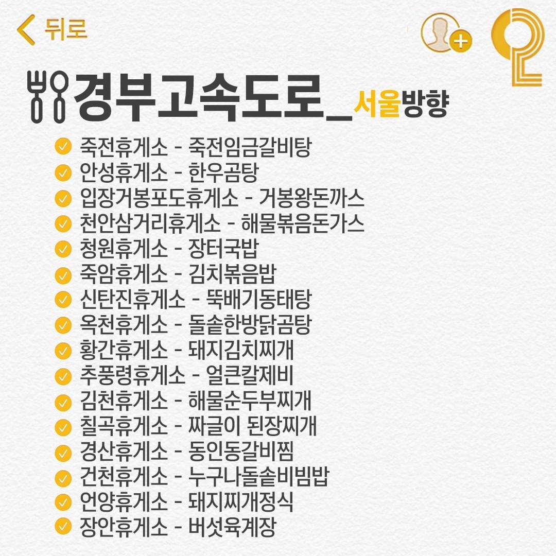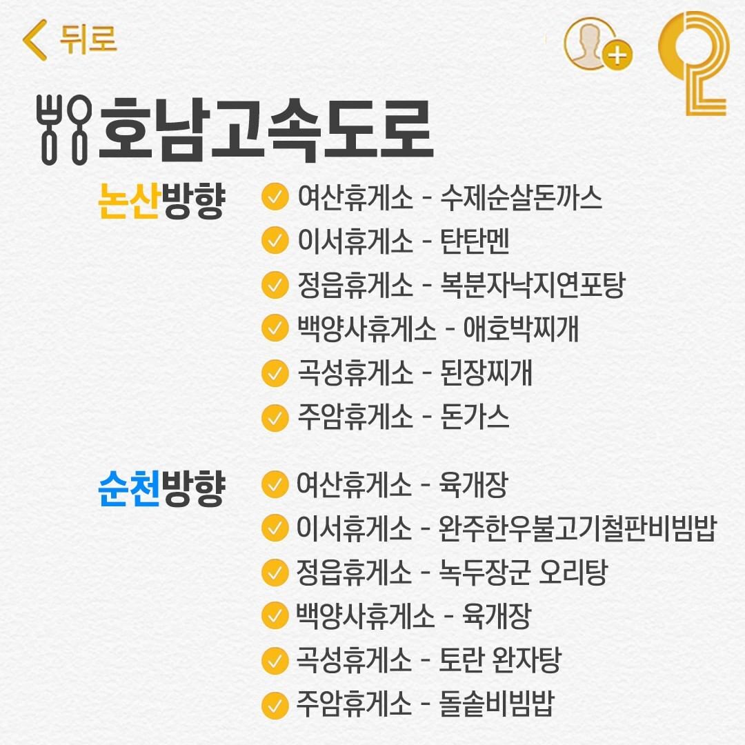 전국 휴게소 맛집 리스트. 그 휴게소를 대표하는 사람들이 가장 많이 찾는 추천하는 음식인데 그렇다고 해서 진짜 노포들처럼 줄서서 먹어야 할 정도의 맛이 있거나 하는건 아니고 해당 고속도로가 위치한 지역 근방 유명한 지역 유명음식들을 메뉴로 내고 있어서 맛집이라고 하는 경우가 많으니 너무 큰 기대를 하지는 마시기 바랍니다.